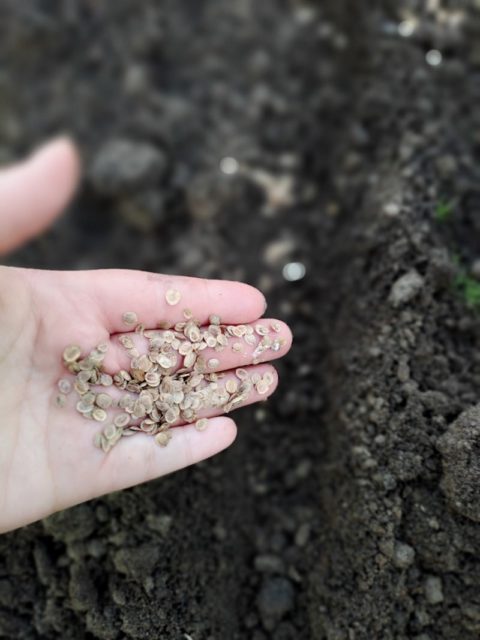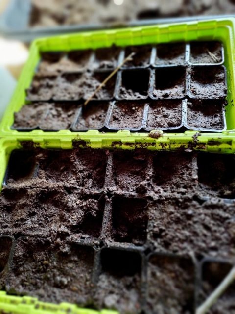 Täytä ruukut kasvualustalla ja kastele kunnolla. Tämän jälkeen tasoita pinta ja tee kolot siemenille.