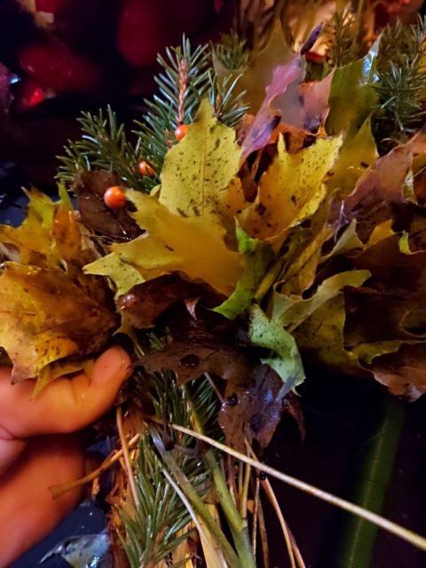 Kuvissa näkyvässä kranssissa on käytetty vaahteranlehtiä, kuusenhavuja ja ruusunmarjoja. Pidän näistä materiaaleista, koska niitä pyöritellessä ei nokka kauan tuhise. Helpoin tapa kiinnittää nämä materiaalit on langalla pyörittäminen. Ota käteesi nippu lehtiä ja pyöräytä pohjaan kiinni. Niin yksinkertaista se on. Tasaisemman näköisen lopputuloksen saat kun valitset pienemmät lehdet renkaan sisäpuolelle ja isoimmat ulkopuolelle. Voit lisätä tekstuuria laittamalla joukkoon oksia, marjoja ja havuja. Vaahteranlehdistä saa myös pyöriteltyä kauniita ruusuja. Yksinkertaisen tyylikkään kranssin saa kun tekee sen pelkistä vaahteranlehtiruusuista.